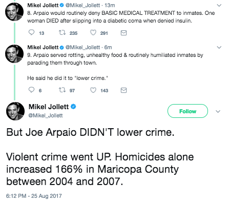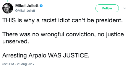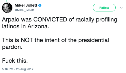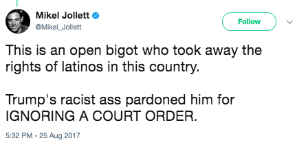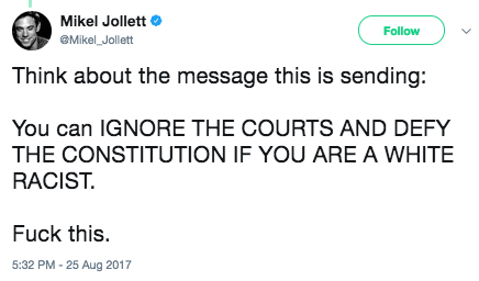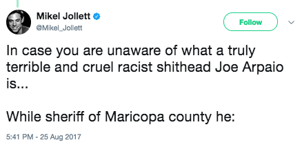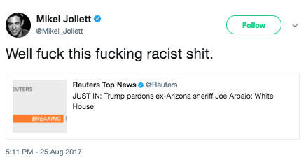 Another Day in White Supremacy (8/26/17): The absolute piece of shit known as Joe Arpaio should be rotting in a jail cell, but the even more disgusting, festering pestilence known as Donald Trump pardoned him today. Using the cover of an oncoming hurricane, and the slow news day of a Friday, Trump also signed a ban on the military paying for reassignment surgery (more on that later). Absolutely disgusted! (x)