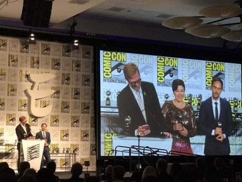 Last night, JUGHEAD won the Eisner Award in the Humor category! I couldn’t be at the ceremony, but it was pretty great to see photos of my pals, Ryan, Erica and Derek, up there getting those trophies. I think that’s Ryan reading my too-long speech that I sent him in case we won (I stole that pic from Comixology. SORRY).