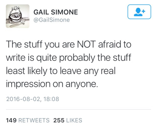 “The stuff you are NOT afraid to write is quite probably the stuff least likely to leave any real impression on anyone.” (Gail Simone)