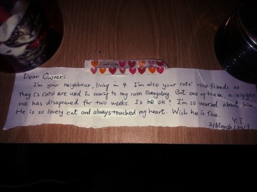 Bear and his brother Teddy were always together, sharing their every adventure. What their humans (reddit user TravUK) didn’t know was that they had made a friend next door for quite some time.Two weeks ago, Bear suddenly passed away. As the couple was still in mourning, they came to find a note attached to Teddy’s collar one day. That’s when they realized that someone else they had never met was also missing their cat.The note reads: “Dear Owner; I’m your neighbour, living in 4. I’m also your cats’ close friends as they (2 cats) are used to coming to my room everyday. But one of them, a bigger one has disappeared for two weeks. Is he ok? I’m so worried about him. He is so lovely cat and always touched my heart. Wish he is fine. - Y.T. 2/March/2017.”