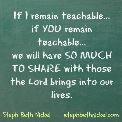 We Must Remain Teachable, by Steph Beth Nickel I can’t remember not being a Christian. I believe I went from a childish faith right into a childlike faith. And by now, with the dawn of my 55th year on the horizon, you’d think I would have it all together—or at least be well on the way.