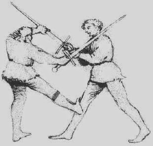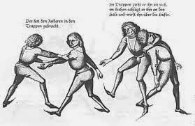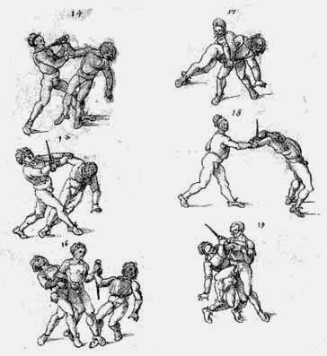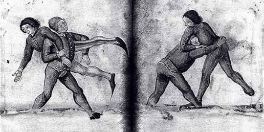 That's Jujutsu...in the European Middle Ages. The one on the left is, I think, a hip throw. We all know the one on the right, a Jujutsu choke popular in MMA.