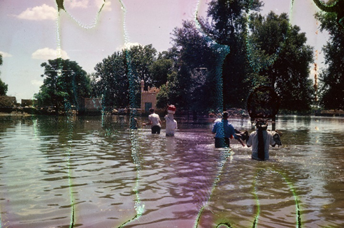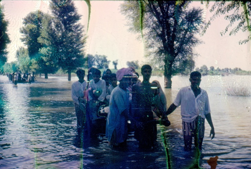 Hugh Gordon and his family had a house in Khanpur. The Bastians and Lindsays, who were on furlough at that time, had also stored their things there. A party of us including Hugh, who had just returned from furlough along with Pastors Nawaz and John set out in an attempt to assess the damage to their houses and the church. A jeep took us to within three and a half miles of the town. From there we waded through the stinking waters along with streams of refugees both coming and going. Some were returning to check that their homes hadn’t been looted. Others were taking their scanty possessions and animals out to higher ground.