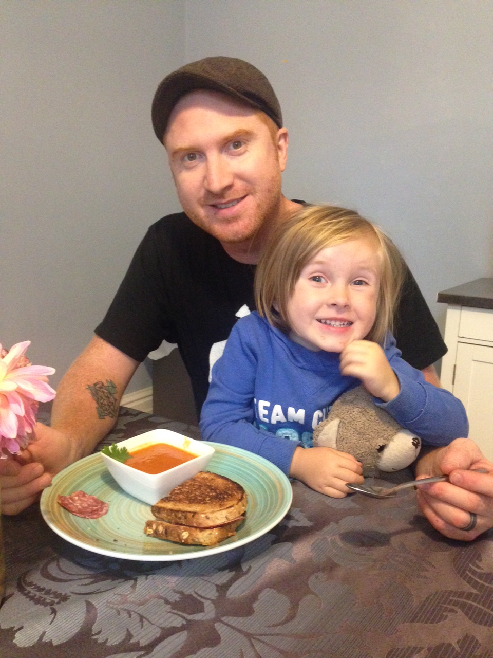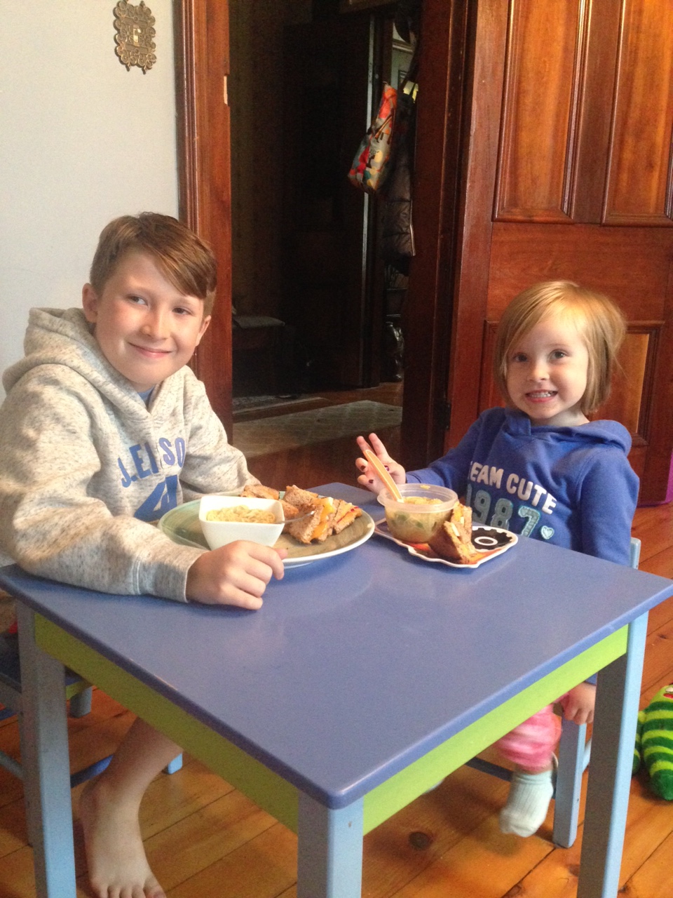 After 4-5 minutes, flip. Let the other side brown for an additional 4-5 minutes, until bread is toasty and cheese is melty. Cut in half or quarter and enjoy! We paired it with a nice Thai Coconut soup while the kids had Chicken Noodle.