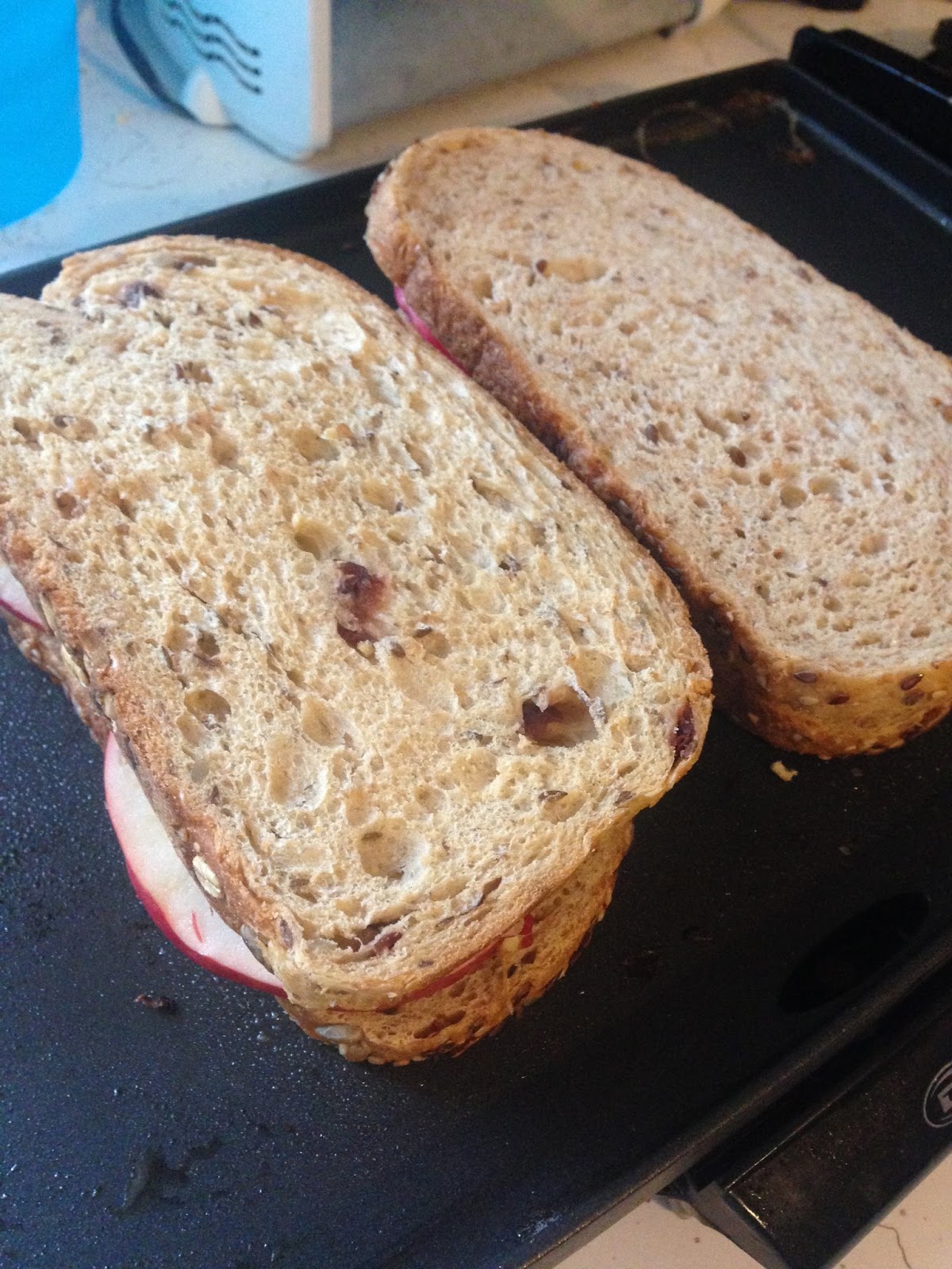 Spray griddle with non-stick spray, oil or butter two slices of bread and set them aside. I like Bavarian Cranberry and nut. Spread a thin layer of dijon mustard on the other two slices.