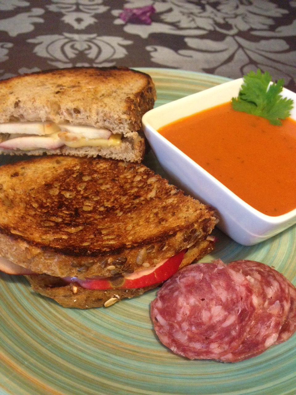 On Friday night my hubby stopped by on his way home from work and picked up a variety of Stilton, Apple Smoked Cheddar and Gouda! Yum! So now it's Sunday and we're experiencing a blustery fall day. Let me see we have a bag full of cheese and a crisper full of fresh apples from my parents apple tree. What to do....what to do. Personally I grew up on grilled cheese and tomato soup. Not too heavy, but still warm and deeply satisfying, so how about a twist on an old favorite?