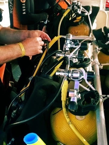 Dive one: 10-meter dive (30-feet, 28 minutes). Tried a nitrox bottle. (34% oxygen/66% air) Saw a brown fish. Blah!
