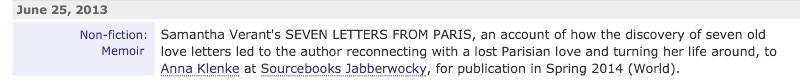 Those of you who have been following my blog for some time know how hard I had to work to get my memoir published. For those of you who are unfamiliar with my journey, I'd been working on SEVEN LETTERS FROM PARIS for four years. In 2009, I wrote the story as it happened to me. In late 2010, I began contacting agents, sending off twenty-one queries. I believe the full was out with five or six agents when I received an offer of representation in January of 2011. Unfortunately, at this time an article bashing 'me'-moirs created some havoc, so we decided to hold off on submissions until the market for memoir heated up.