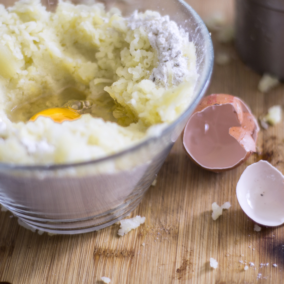 Ingredients for the Gnocchi: 2 medium-sized potatoes, preferably Yukon Golds (but use what you've got!)Two cups all-purpose flour, plus extra1 pinch of salt1/2 cup ricotta cheese1/2 cup parmesan cheese, plus freshly grated for garnishOne eggBasil/chives (for garnish) Fresh ground pepper (garnish)