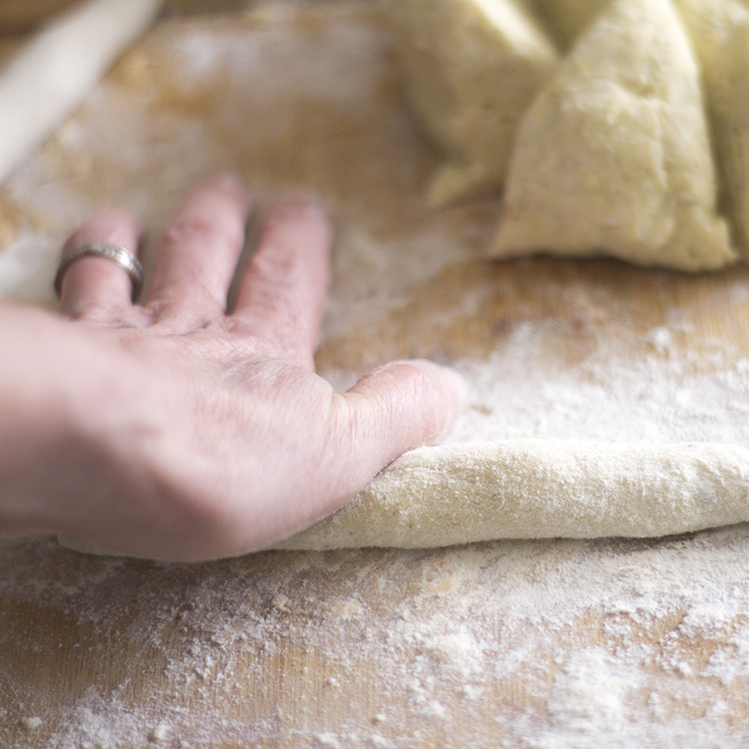 Pour two cups flour into a large mixing bowl and create a hole (think volcano), to place the ingredients in the "nest"– the nutmeg, cinnamon, salt, ricotta, parmesan, and using, a handheld potato ricer, squeeze the meat of the potato on top of all this. Then, add the egg. Mix well. Transfer to a floured cutting board/work station. Roll out the dough using the palms of your hands, pushing it until it's smooth. (It's a workout!) If the dough is too wet, add a bit of flour. If it's too dry, add a bit of water. Work that dough--and your arms! Finally, when it's ready, nice and smooth– shape it into a ball. Cut the ball into six-eight pieces. Flour your board again. Take each piece and roll it into a long snake- about 3/4" thick.
