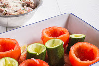 Tomates et Courgettes Farcies is one of my favorite recipes to make for the family. It's easy. It's simple. And it tastes good. I like to chop everything up on my plate and combine everything together. (That's the way we do it here in La Belle France, at least in my house). Even our non-vegetable eating kid has no complaints for this dish-- although he typically removes the parsley garnish). It's kind of like the American version of stuffed peppers I had as a kid. Hey, if you want to stuff peppers- try that too! (I'd go with medium sized...no tomatoes or zucchini). Just cut off the caps, de-seed, and stuff!