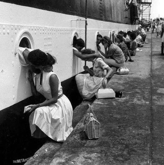 We talked for a long time and then the lack of sleep and proper food kicked in and I had to go out on the deck to get some fresh air. He followed me and I said I really wasn’t feeling well and he could just leave me out there for a bit. Being a stubborn Dutchman, he stayed and I ended up ‘chucking my cookies’ over the railing, not realizing until it was too late that it was only to the deck below and not into the ocean. I must have looked as awful as I felt, but he didn’t care and was not put off. Apparently, he was one of the crew members who we had earlier walked in on at the pool and he remembered me.