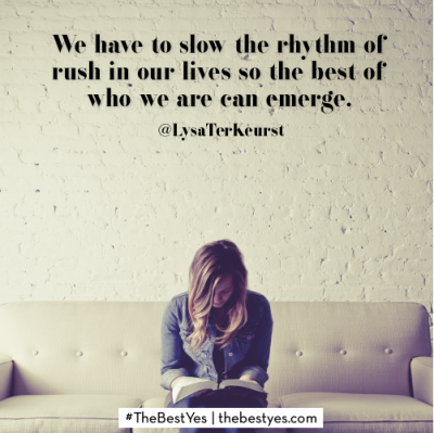 In The Best Yes, Lysa says, “we need to slow the rhythm of rush in our lives so that the best of who we are can emerge,” and in my own life, have found that I have to stay conscious of what happens when I don’t say no.