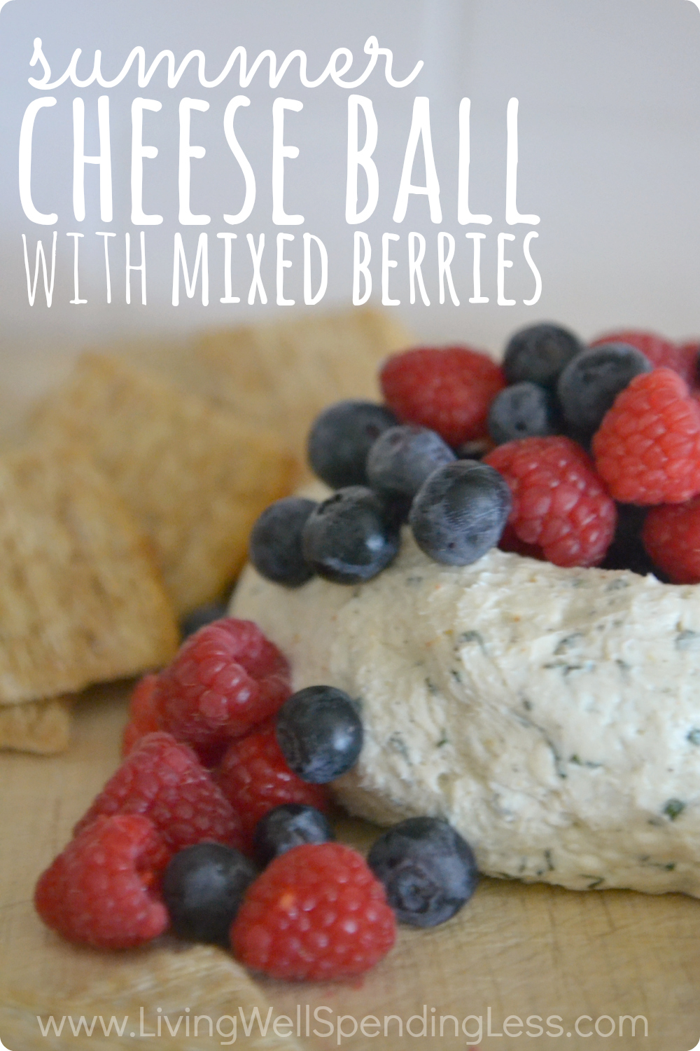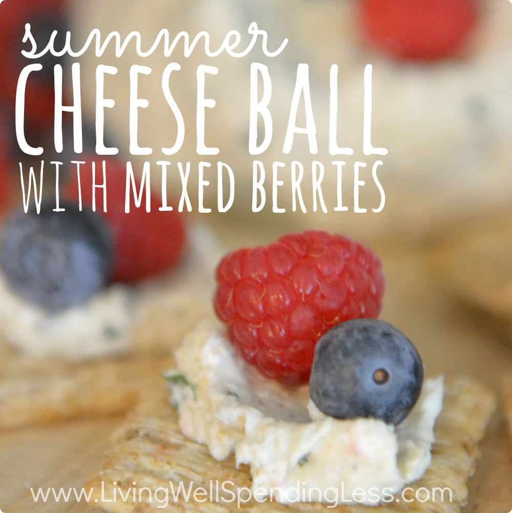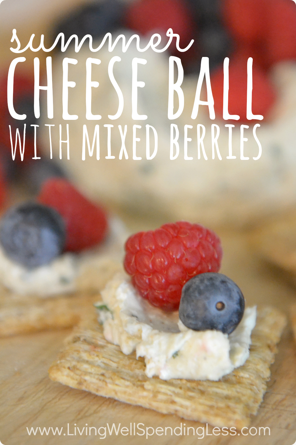 For this recipe challenge I needed to find a way to combine Martha’s selected seasonal ingredient–mixed berries–with Triscuits, (which coincidentally just happen to be my favorite snack cracker of all time), and I knew right away that whatever I came up with would have to be quick, easy, and delicious. The natural choice for me? A Summer Cheese ball with Mixed Berries. Around the holidays I often make this delicious Cranberry and Cheddar cheese ball, so the summer berry & cheese combo seemed like a natural fit. The best part? It took less than 10 minutes to come together, which makes it the perfect lazy summer appetizer.