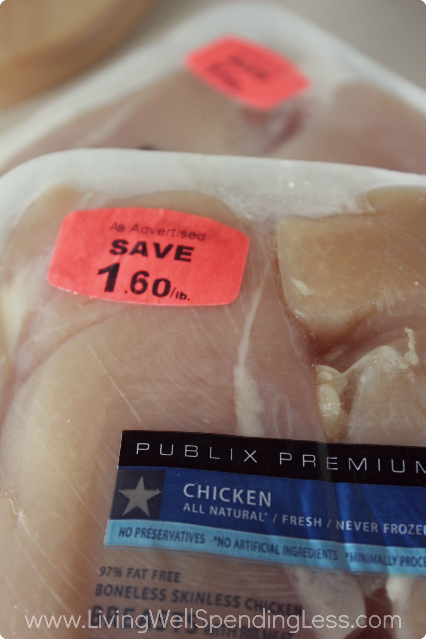 However, you still have to watch what you’re buying. Boneless or thinly sliced chicken breasts cost much more than drumsticks or whole chickens, because you’re letting the butcher do all the work for you. I don’t know about you, but even though I hate touching raw meat, I’d much rather pay less and cut up the chicken myself!
