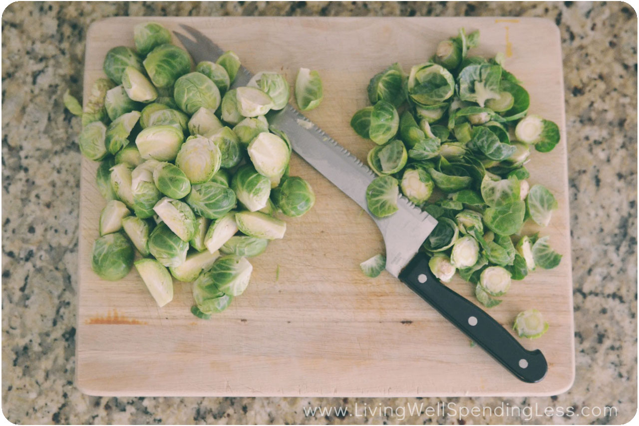 Step 1: Preheat oven to 400 degrees. Cut bottoms & loose leaves off of Brussels Sprouts, then cut sprouts in half or quarters, depending on size, or use the slicing blade of your food processor to slice them into smaller pieces.