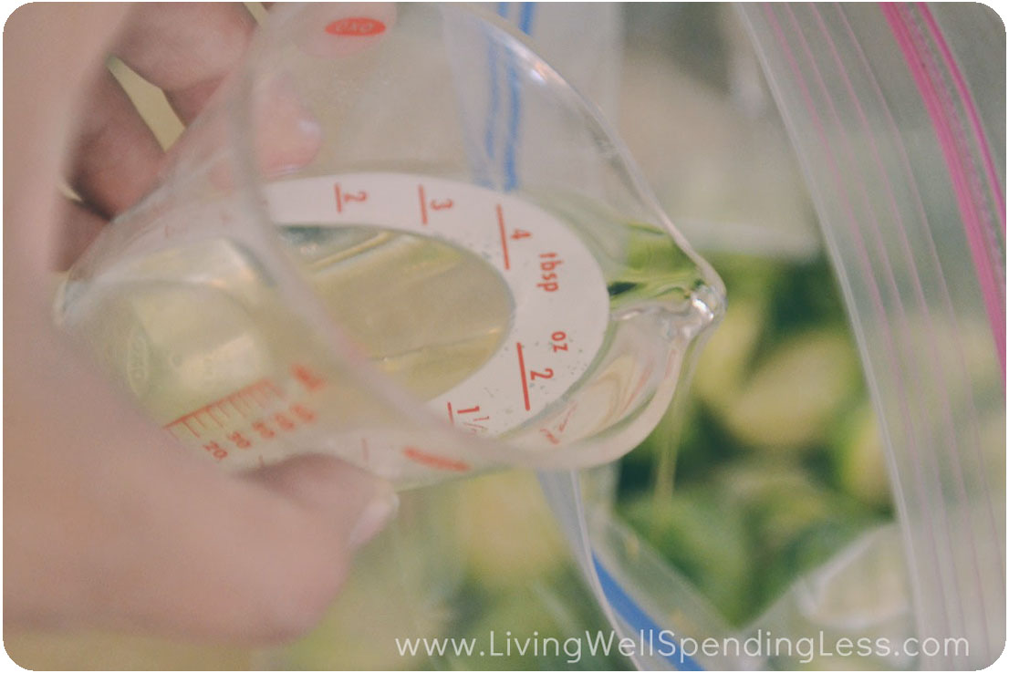 Step 2: Place cut Brussels Sprouts in large Ziploc bag. Pour in 2 tablespoons olive oil. Seal bag and shake well until Brussel Sprouts are coated.
