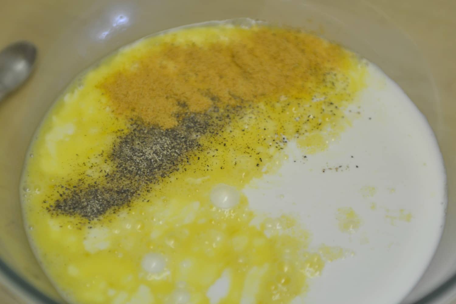 Step 2: Whisk eggs until well blended. Add milk, cream, salt, and pepper and whisk again.