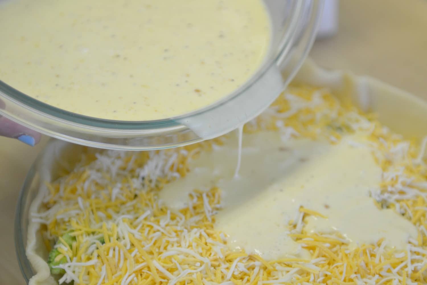 Step 5: Pour egg mixture over cheese, then fold over crust edges as desired.
