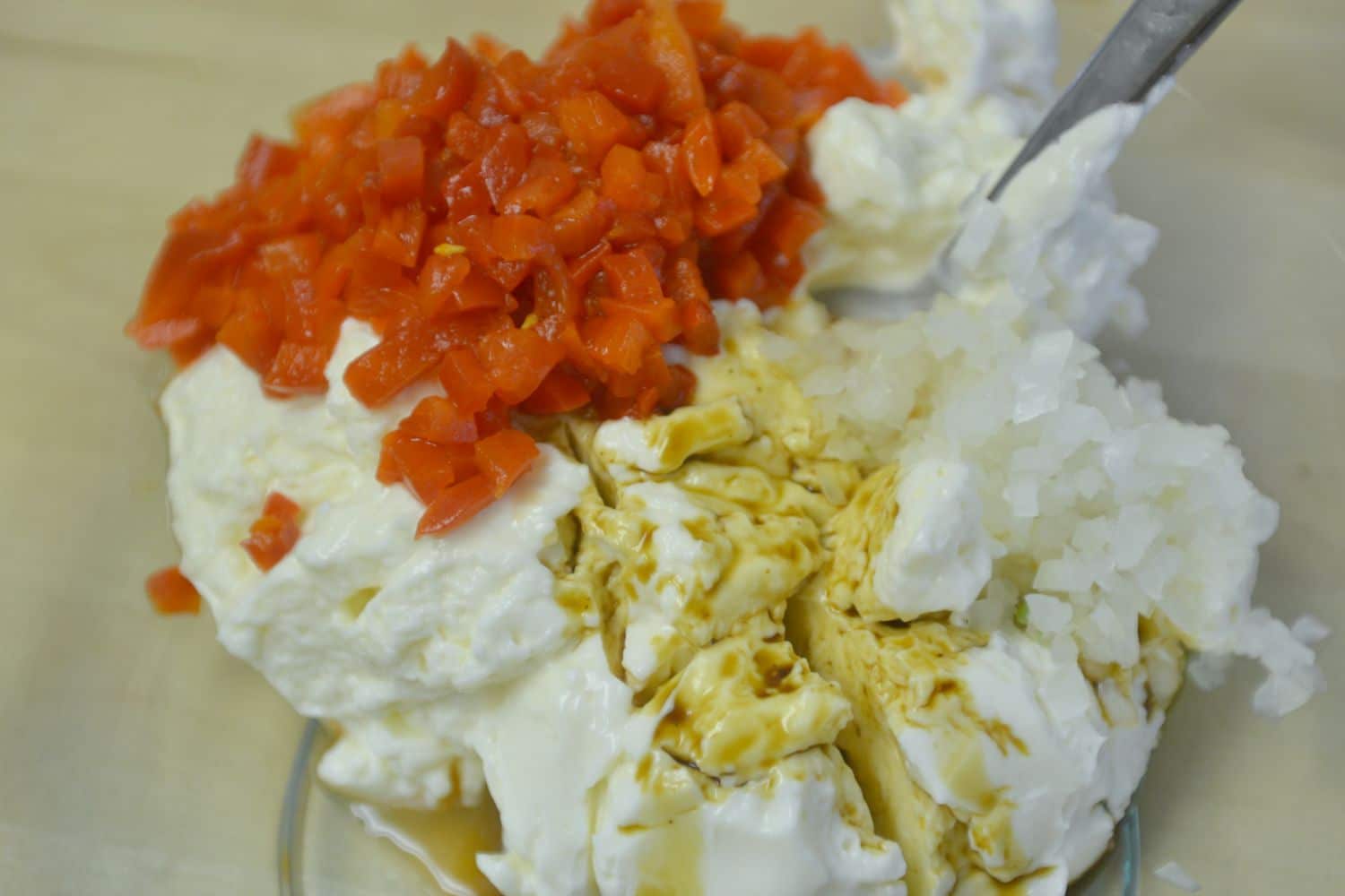 Step 1: Mix the mayo, drained pimiento, Worcestershire sauce, onion and red pepper together in a large bowl until well blended.