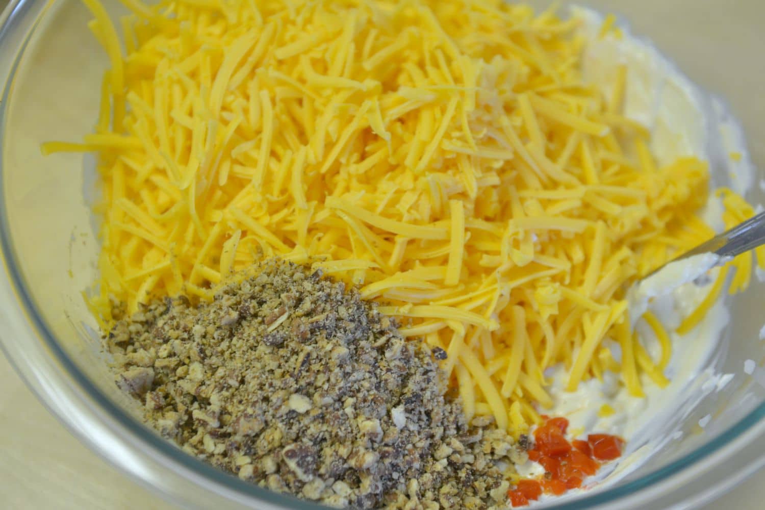 Step 4: Add pecans and cheese to mayo mixture, stirring until blended. Cover and chill in fridge for at least 20-40 minutes; serve with your favorite crackers.