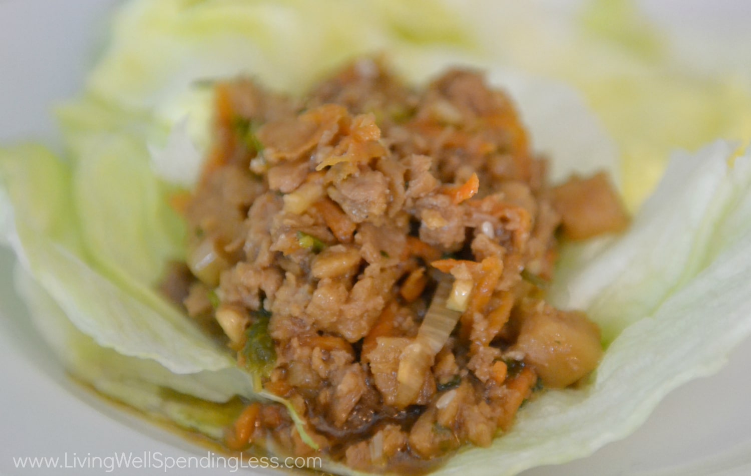 I thought it would be fun to see if we could recreate one of our favorite treats at home, but to be perfectly honest, I was a little nervous about how these crockpot chicken lettuce wraps would turn out, but they were a HUGE hit. Chicken in the crockpot can get very dry, especially when it is cut into smaller pieces. I used boneless skinless thigh meat rather than breast meat because it has a lot more fat, which helped keep the meat nice and moist. I also made a vegetarian version with protein crumbles for me. The whole family gave it a 10, and my dad and stepmom, who happened to be in town, couldn’t get enough!