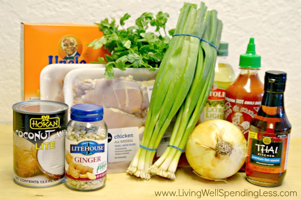 Step 2: In large bowl, whisk together lime juice, coconut milk, fish sauce, Sriracha, olive oil, ginger, green onion, and onion.