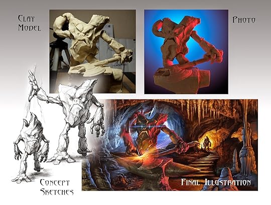 Through the use of modeling, photography, lighting, and other...artisticy (I've been told that's the technical term) type things, he creates beautiful images full of light and color and awesome. Check out the composite below, taking us from concept sketch to finished work. Magical!