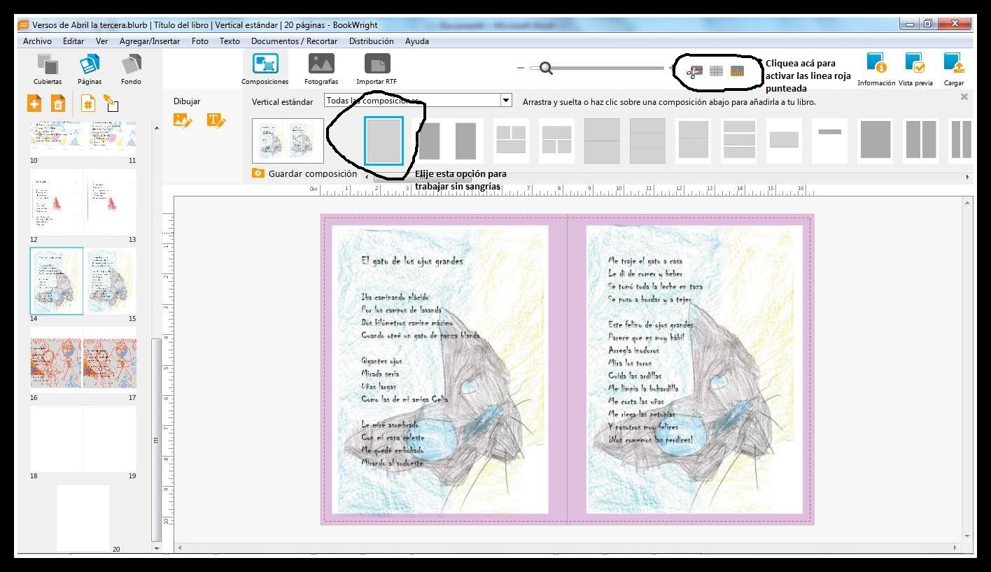 BookWright el programa de Blurb puede ser una buena opción (te lo bajas directamente de su página web). Yo me encuentro dentro de este grupo y por eso te cuento los básicos. Lo primero: no pierdas el tiempo investigando. Hay un magnífico tutorial para bobos que conviene leer. Son dos minutos y te centra en lo importante. Segundo: si vas a publicar o editar un libro ilustrado puede ser una buena idea usar la plantilla que viene determinada como Full Bleeds, es la primera opción que te da. Te pongo un pantallazo. Eso te permite trabajar sin sangrías algo que, en principio, no necesitarás. BookWright te permite agregar texto e imágenes pero yo fui a lo fácil. Integrar el texto en la imagen en Photoshop y ya subir un archivo de imagen (JPG) a BookWright. ¿Te suena a chino todo lo que te cuento? Mejor vivilo vos mismo y volvé cuando tengas dudas. Te resumo los pasos aunque no te voy a repetir cosas que ya están en miles de tutoriales.· Abres un documento nuevo· Le pones nombre· Seleccionas el formato full bleeds tal como te conté· Arrastras las imágenes · Ocúpate de que tu imagen vaya hasta un poco más allá de la línea roja punteadao Para que aparezca esa línea punteada recuerda que puedes activarla en el cuadradito que tiene la tijerita (te lo marco en el pantallazo)Ya estoy casi en la fase final (que nunca suele ser la final). Una vez que tenga todas las imágenes, generaré un PDF, lo imprimiré y veré qué puedo corregir. Mientras tanto, debo trabajar en la portada. Lo dejo para otro post. Hoy tengo mucho calor. Dicen que mañana guardamos las sandalias y sacamos las botas de lluvia.