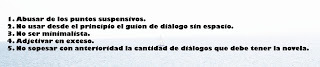 1. Abusar de los puntos suspensivos. Es terrible. Están por todos lados y no sé por qué se me ha pasado este asunto. Los puntos suspensivos tienen un uso muy concreto y su abuso solo afea el texto. Evítalos todo lo que puedas.2. No usar desde el principio el guion de dialogo sin espacio. Recuerda. Después del guion o raya de dialogo no debe haber espacio. Si piensas que mejor escribir del tirón y después corregir, te estás equivocando. En este asunto conviene no perder el tiempo. Hazlo bien desde el principio y te ahorrarás tener que revisar todo otra vez.3. No ser minimalista. En este asunto hay que ser lo menos farragoso posible. Evitar las acotaciones. No es fácil y he intentado evitarlas pero más de una vez se me cuelan más de lo deseado cayendo en repeticiones odiosas del tipo: “dijo, respondió, aclaró”. 4. Adjetivar en exceso. Sin darme cuenta este asunto lo he pasado de largo en los diálogos aunque no tanto en el texto. En las acotaciones en vez de nombrar la emoción de un personaje mejor describir sus signos externos. Aquellos que pueden denotar un estado de ánimo sin necesariamente nombrarlo. Es más sutil y suena menos a novela juvenil barata. Es decir, en vez de decir: “sonrió nervioso” puedes decir: “sonrió forzando excesivamente la comisura de los labios. Una arruga profunda surcó su delicada piel.”5. No sopesar con anterioridad la cantidad de diálogos que debe tener la novela. A menudo tengo la sensación de que mi novela tiene demasiadas conversaciones entre personajes y me pregunto si le resta credibilidad a la obra. No sé muy bien porqué pienso esto pero puede ser un recurso muy entretenido pero al mismo tiempo se puede caer en el facilismo. Mucho diálogo creo que resta calidad literaria. Este último punto lo tengo que meditar. No lo tengo del todo claro.
