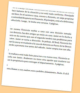 Ya he comentado que estoy haciendo una escaleta de mi novela. Para los que no están familiarizados con el término, es como un resumen pequeño de cada capítulo que sirve para ordenar todo el documento. Lo usan mucho los guionistas y todo lo que se cuenta es en presente. No es una sinopsis. Se supone que se escribe antes de empezar a escribir realmente la novela. Te guía en el laberinto de historias, contextos, climas, relojes, etc. Yo no he seguido ese camino. Lo que he hecho es hacer la escaleta a posteriori, lo cual tampoco es una mala idea. Ayuda a dar coherencia a toda la historia. ¡Y es genial! Tomas nota de cosas muy simples como, el tiempo que hacía en una escena concreta, también te recuerda los nombres de los personajes (sí!! Soy una colgada y he cambiado los nombres de algunos por puro despiste).Otra ventaja de la escaleta es que te impulsa a mejorar la novela en sí porque para hacer la escaleta tienes que leer sí o sí todo el capítulo y en el ínterin, corriges y embelleces cosas. O por lo menos, lo intentas