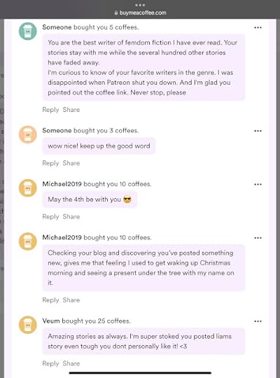 NO ONE PAY ANYTHING RIGHT NOW- let me write a story, for fun, because I want to see that world explored as much as you do, and then AFTER, IF you liked it, we can talk about donations on the Coffee link on the right. I'll report a month after publishing, what the total donated was, so all can see how that turned out.
