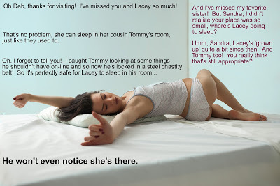 A red-faced Troy was being helped down the hall by the blonde nurse back to the waiting area. "Now, you'll feel a little woozy for a bit," Gretchen giggled. "And you'll need someone to help tuck your stiffy into your underwear and zip up your jeans just like I had to do for you just now. At least for the first day," she laughed, as the boy blushed even more. "But the force field will shrink to normal size after a few days, so later you can dress yourself even if you get a boner while doing it. Or maybe you'll find some cute girls at school to help you out with that, hmmm?"Troy was light-headed, swaying on his feet. "I don't... know. I still can't believe I can't... touch myself anymore!" "Oh, you probably won't even miss the little thing," the nurse giggled. "You'll have other things to occupy you second term. Here we go, here's your sister to help you get home."Jessica jumped out of her seat and gave her brother a big hug. "Hooray Troy! You just solved your jacking off habit forever- I'm so proud of you!" He pushed her away as a few mothers in the waiting room chuckled. "You knew?! You knew that's what the appointment was for?"Jessica laughed again. "Knew? Mom had me make the appointment! That's why SPU sends the letters to the boys' parentsinstead of the boys. They know you'd never walk in here for a Willy Wanker on your own!" Troy groaned as all the women in earshot chuckled again, then jumped as the nurse gave his ass a pinch as she left. "Good luck at school! Study hard!"Troy still couldn't believe what had happened as Jessica helped him out of the doctor's office, across the parking lot, and into the passenger seat of their SUV. It was only when they were driving away when it hit him. "Wait a minute! We don't take the train to SPU for another two weeks!” he cried. “Why the hell did you make the appointment for todayinstead for the day before I left?!"And Jessica laughed all the way home.