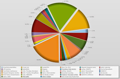 I spent the most work time rewriting Waypoint Kangaroo, the novel which went out on submission in mid-October, but as you can see, the second-biggest time slice (nearly 18%) is Puzzled Pint.