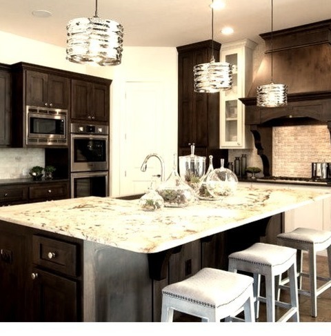 Mid-sized l-shaped medium tone wood floor kitchen pantry photo with dark wood cabinets, granite countertops, beige backsplash, stone tile backsplash, stainless steel appliances, an island, a farmhouse sink and shaker cabinets