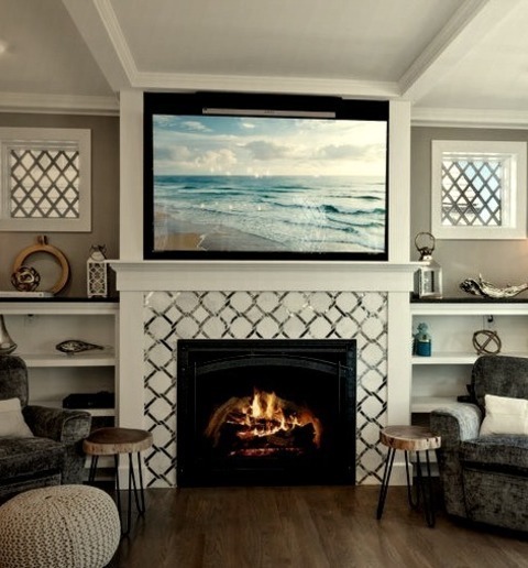 Example of a large, modern, open-concept living room with a bar, gray walls, a tile fireplace, a standard fireplace, and a light-colored, beige floor. The room also has a wall-mounted television.