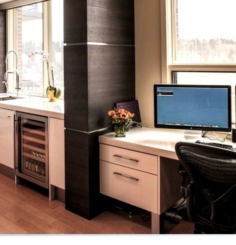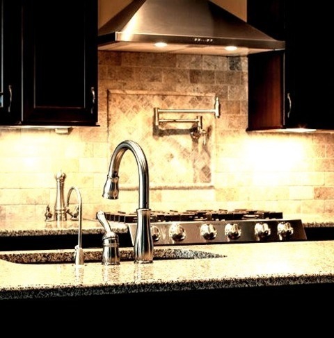 Enclosed kitchen - large transitional single-wall dark wood floor enclosed kitchen idea with an undermount sink, shaker cabinets, dark wood cabinets, granite countertops, beige backsplash, subway tile backsplash, stainless steel appliances and an island