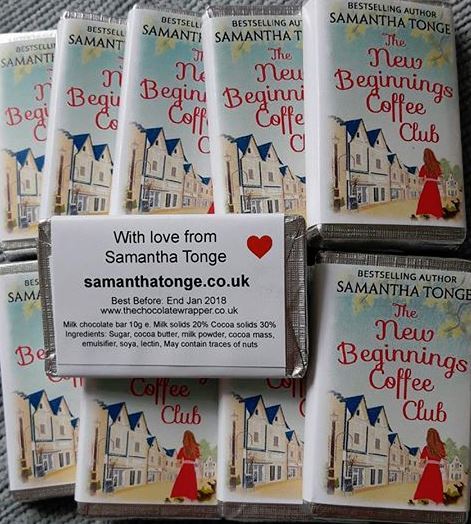 Give and take – understand that networking is not all about me, me, me. It’s about respecting the other person and also helping them if possible. No blogger or fellow author wants to stand chatting to a writer who does nothing but promote their own work and hand out business cards. Show an interest. Ask the other novelist about their latest book. Find out what that blogger really likes to read and enquire about their day job. Basically, be good-mannered as you would in any other situation. I’ve found the writerly world to be super supportive but that works both ways. Of course hand out promotional material, if someone shows an interest – but do it subtly. I attended a blogger/author meet in Birmingham this Saturday just gone (see previous post!) and very much enjoyed handing out some of these promotional chocolate bars (which are actually tiny and probably went in one mouthful!). They are for my latest book, The New Beginnings Coffee Club. Some went to friends – others to people who didn’t know my work. The recipient gets a tasty treat and probably won’t throw it away like they might a business card!