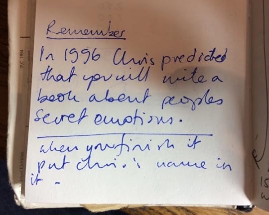 When I was in Sydney in 1990, I stayed at a backpacker’s called The Pink House, where I met a guy called Chris. Chris predicted that I would write a book about people’s secret emotions. It turns out, much as I scoffed at the time, that Chris was right. Twice the Speed of Dark was published in November – a book about the private ravages of grief. On the next page from the one in the photograph I wrote ‘apparently he thinks I will write strongly and vividly about people’s secret emotions’. I hope that I have indeed done that!