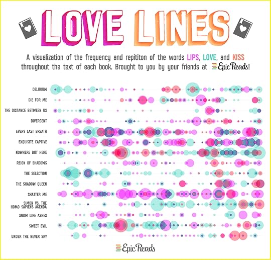 Romance is a BIG part of YA, so I love this infographic from the brilliant site Epic Reads which shows us – in glorious technicolour! – just how many times words like LIPS and KISS appear in various celebrated YA books featuring romance.