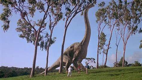 Crichton wrote the screenplay along with David Koepp. The corporate thriller aspects were jettisoned, to get us to the island quickly. We see Isla Nublar at the 16-minute mark, and three minutes later comes our first resident, the brachiosaurus (changed from the book’s brontosaurus, because the brachiosaurus grazed from tree canopies rather than low plants, allowing for that iconic shot when Alan and Ellie first see a dinosaur). Now there’s barely any wait for the cast to catch up with the audience.