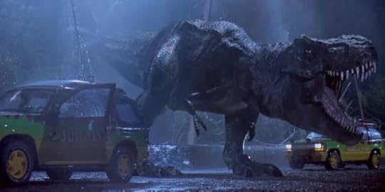As the park tour begins (exactly a quarter of the way through), Crichton hits his stride. Whilst many novels and films struggle to maintain momentum through Act Two, this is the book’s best section. The build-up to the storm, and the tyrannosaur’s first appearance, are superb. Interestingly, these scenes are written from Tim’s POV. I don’t know if these came from Crichton’s original drafts, but they are very effective.
