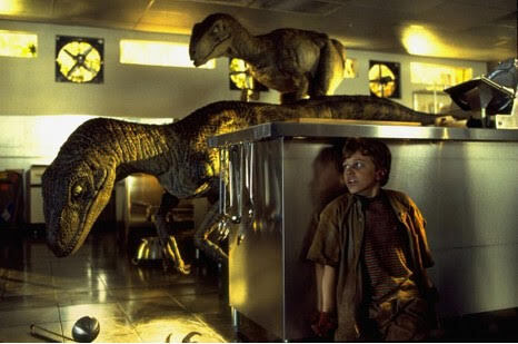 At this point, Crichton introduces a countdown element: Lex spies raptors on board the supply ship returning to the mainland. Because there’s no way to contact anyone and warn them to recall the ship, Alan and the kids have a small window of time in which to get back to the visitor lodge.