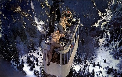 There is one other significant character change: Captain von Brauchitsch becomes Major von Hapen, and is repositioned as the film’s primary villain. As with other cinematic Gestapo agents (Raiders of the Lost Ark’s Toht) von Hapen puts everyone on edge. From his first introduction, meeting Rosemeyer – in a scene not in the book – von Hapen exudes menace; even the cable-car operator bricks it when he discovers whom he has kept waiting on the phone when the Major rings for a car. Played with steely eyed glee by Derren Nesbitt, it’s surprising von Hapen’s role wasn’t further expanded, perhaps leading the chase at the end, because he is easily the best of the antagonists.