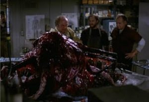 Where the film comes into its own is with what’s added. This camp doesn’t ‘find’ the Thing, it literally runs up to them, disguised as a huskie. When MacReady visits the Norwegian camp, the corpses found there prime us for what follows. And what follows are some of the goriest special effects ever – courtesy of 22-year old (really!) Rob Bottin and his team, with help from Stan Winston (he did the dog-Thing that gets torched). Universal initially budgeted the effects at $200,000. They came to $1.5m – and every cent is there, on screen.