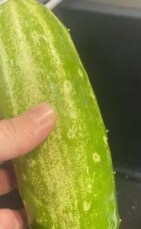 Partially washed by there are still a couple of spines on the side =)I wouldn’t have even known to research what cucumbers look like on the vine. They have spines on them that rub off when you wash them later, but if you grab a cucumber directly off the vine, watch out, it might bite.