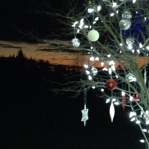 Holiday lights and tree ornaments are done! A beautiful November 1st at sunset #bliss #november #ornaments #tree #holidays #holidayseason #sunset #dusk #magical