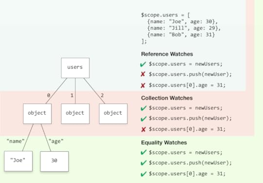 There are three different mechanisms for watching a value on an Angular scope: Reference watches, collection watches, and equality watches. The difference between the three is in the depth in which they watch their values.