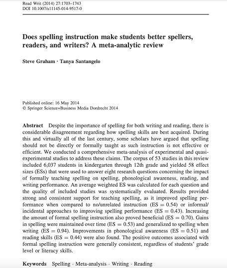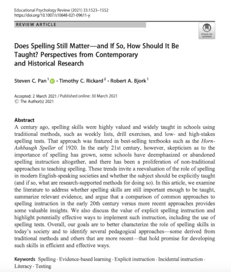 ‘Does Spelling Still Matter—and If So, How Should It Be Taught? Perspectives from Contemporary and Historical Research’, by Pan, Rickard and Bjork.Does spelling still matter? Spell-checking simply hasn’t made spelling instruction obsolete. Spellcheck and autocorrect are not foolproof, but more importantly, reading, writing, and vocabulary development are all linked to the foundational skill of spelling. Spelling can prove a particular constraint of writing development and quality… SEE HERE.