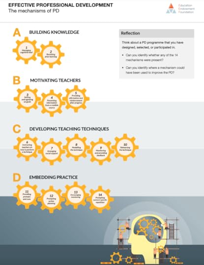 Effective Professional Development – EEF Guidance ReportThis guidance report does a really helpful job of defining what are the key ‘mechanisms’ that can help drive effective professional development. By identifying these supporting mechanisms, paying close attention to developing some of them (such as ‘social support’ or ‘prompting action planning’), you can help support and sustain professional development… SEE HERE.